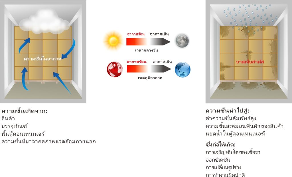 สินค้าที่ขนส่งในตู้คอนเทนเนอร์ทางทะเลมีความเสี่ยงสูงต่อความเสียหายจากความชื้น เนื่องจากสภาพภายในตู้คอนเทนเนอร์สร้างสภาพแวดล้อมที่เหมาะสำหรับการสะสมความชื้นซึ่งเพิ่มความเสี่ยงต่อความเสียหายจากความชื้น ในระหว่างการขนส่งทางทะเลอุณหภูมิภายในตู้คอนเทนเนอร์จะผันผวนอย่างมาก อุณหภูมิที่ลดลงทำให้เกิดการควบแน่นของน้ำ เนื่องจากอากาศเย็นจะกักเก็บน้ำไว้น้อยกว่าอากาศอุ่น