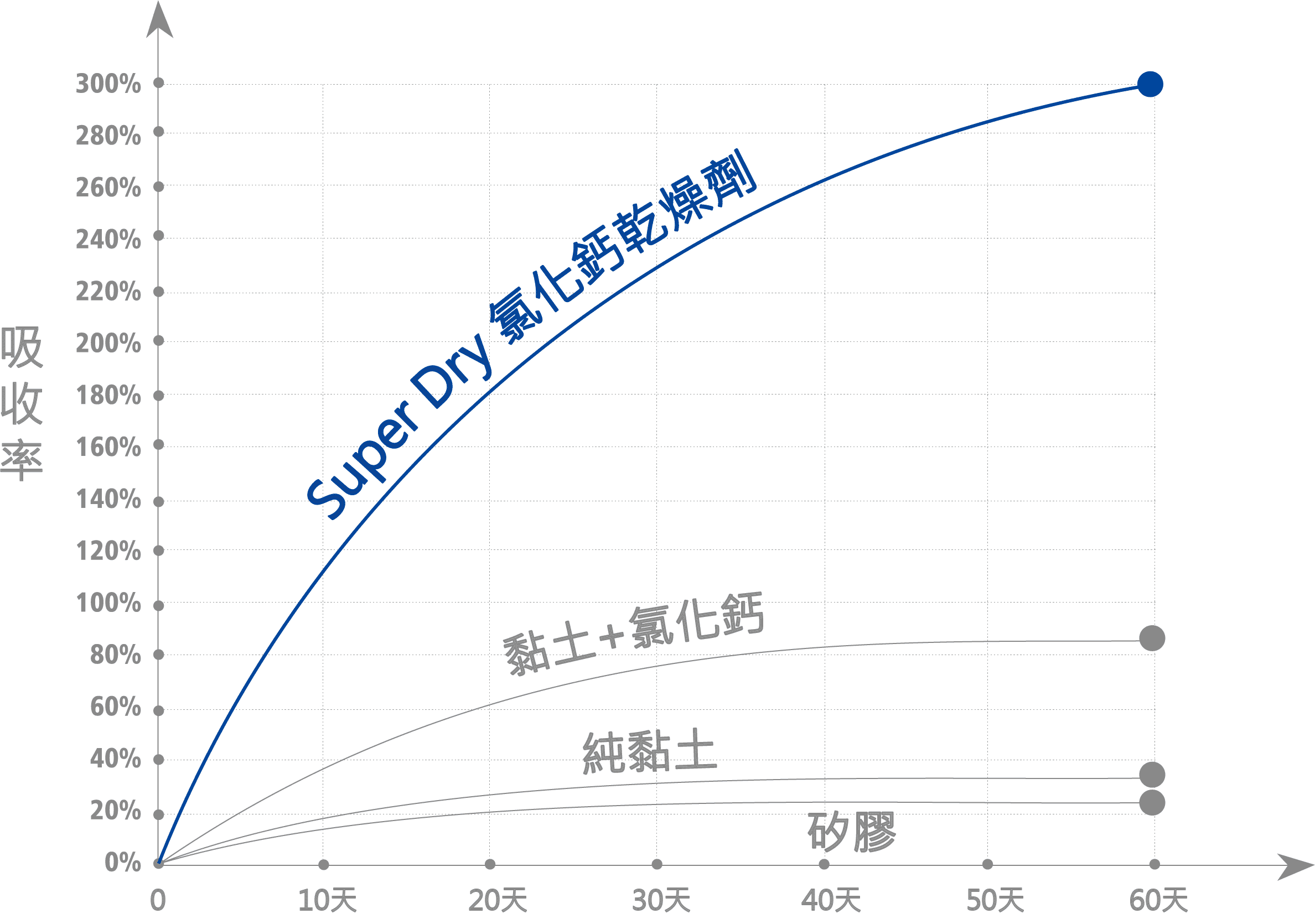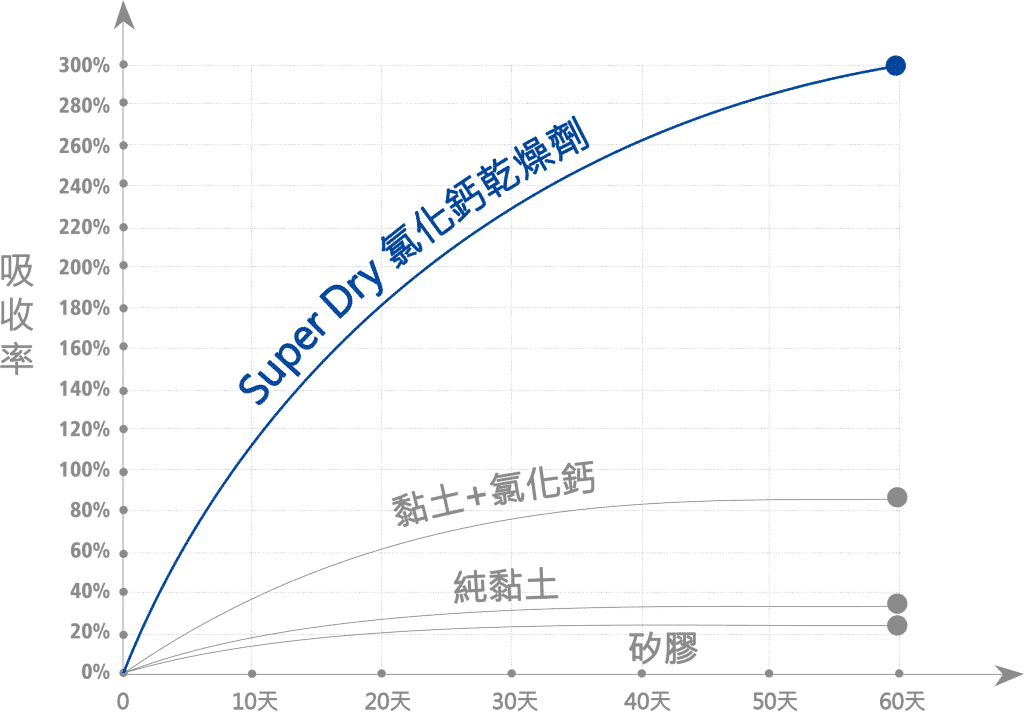 SUPER DRY 乾燥劑經驗證,其吸收能力超過其淨重的 300%,並可在 -5°C 至 +90°C 的溫度下連續吸收水分長達 90 天。