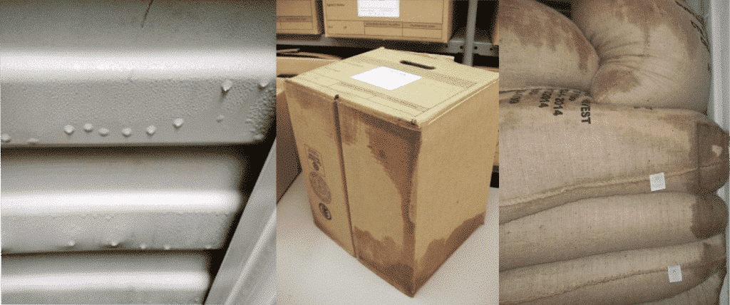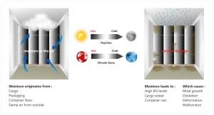 Goods shipped in sea containers are particularly at risk because containers offer an ideal microclimate that increases the risk of moisture damage. During any sea transport, the temperature inside the container fluctuates greatly. A drop in temperature leads to condensation of water, as cold air stores less water than warm air.